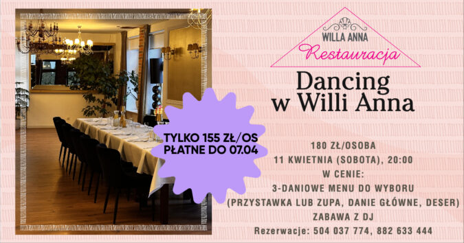 💃🕺 Zapraszamy na Dancing w Willa Anna! 🎶 Już 11 kwietnia 2026 (sobota) o godzinie 20:00 zapraszamy na niezapomniany wieczór pełen muzyki, tańca i doskonałej atmosfery w naszej restauracji Willa…