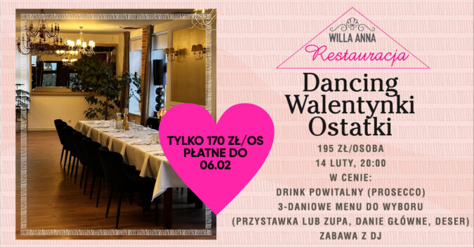 💖 Dancing, Walentynki, Ostatki w Willi Anna! 💃🕺 14 lutego od 20:00 zapraszamy na wyjątkowy wieczór z muzyką, tańcem i pysznym jedzeniem. ✨ W cenie: drink powitalny (prosecco), 3-daniowe menu…