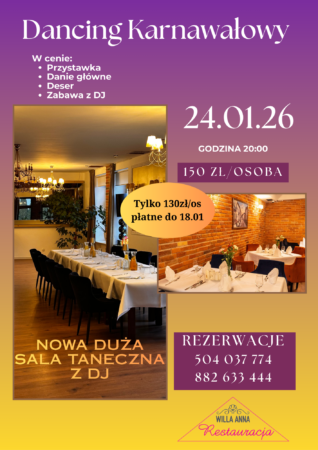 Karnawałowy Dancing 24.01.2026! Mamy przyjemność zaprosić Państwa na wydarzeniu do naszej nowej sali! To na niej DJ zagra najlepsze hity. Dużo przestrzeni tanecznej, która pozwoli na wspaniałą zabawę. 🥳 Zdecydowani,…